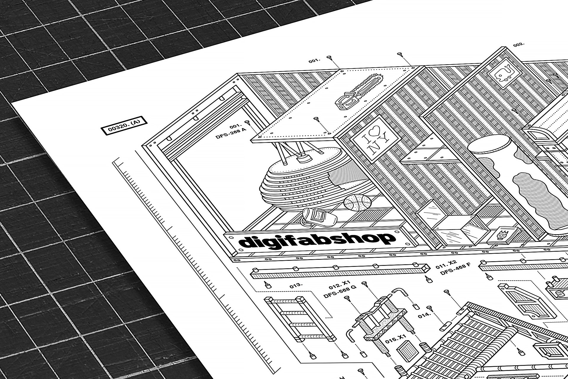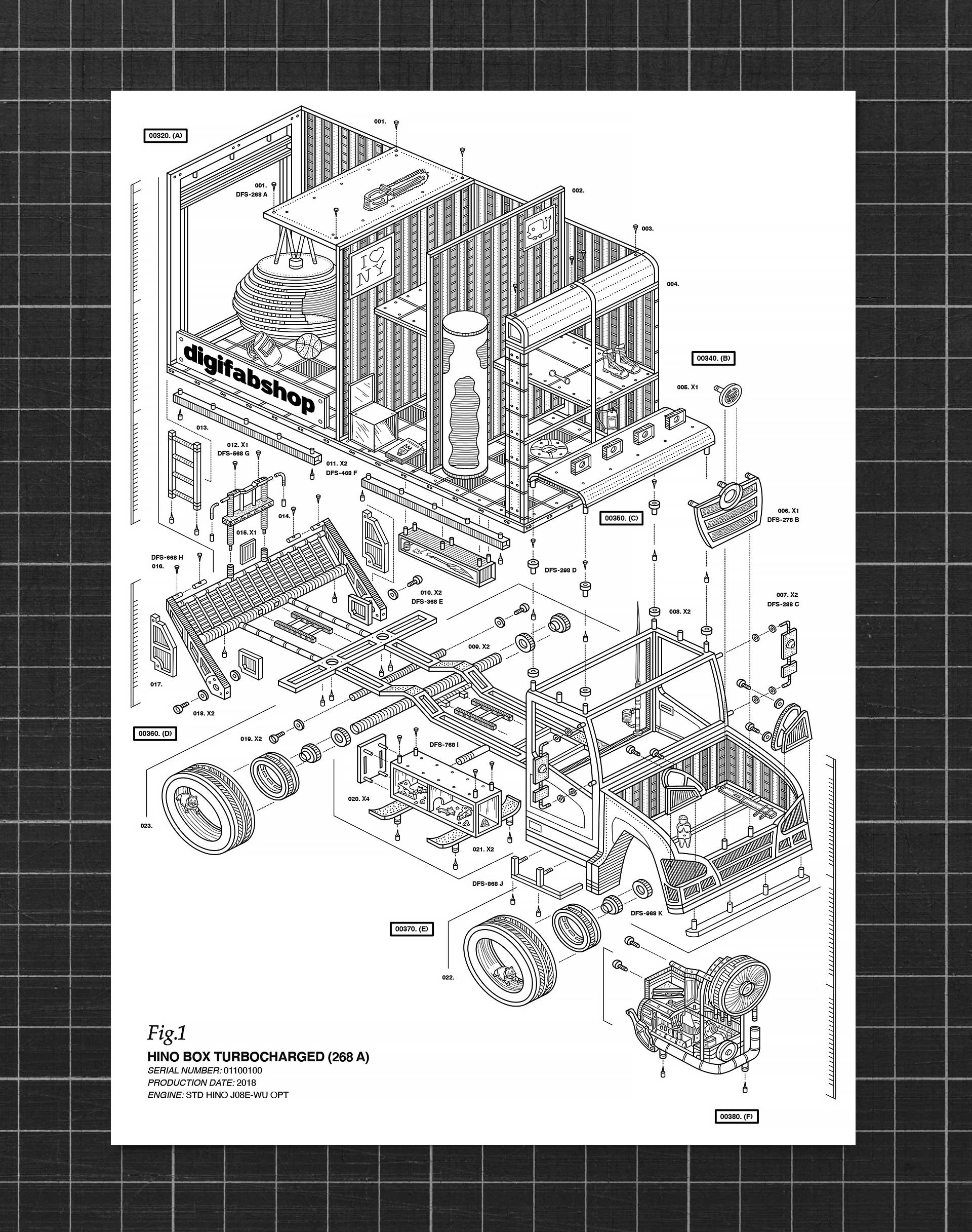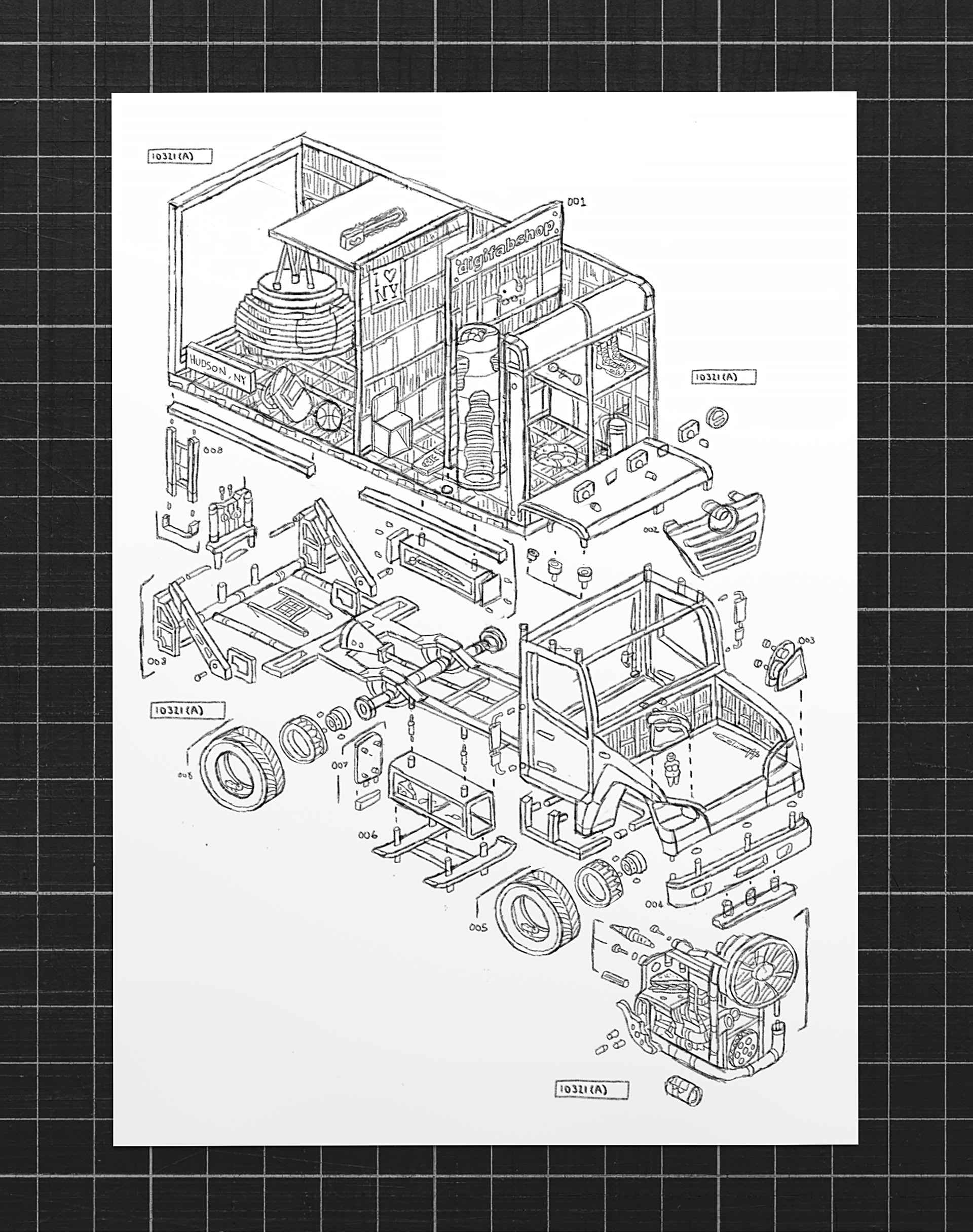 I was commissioned by New York based DigiFabShop to design some apparel for their staff. The illustration depicts their iconic Hino Box truck and contains many hidden objects and references that relate to the company and their location in Hudson.