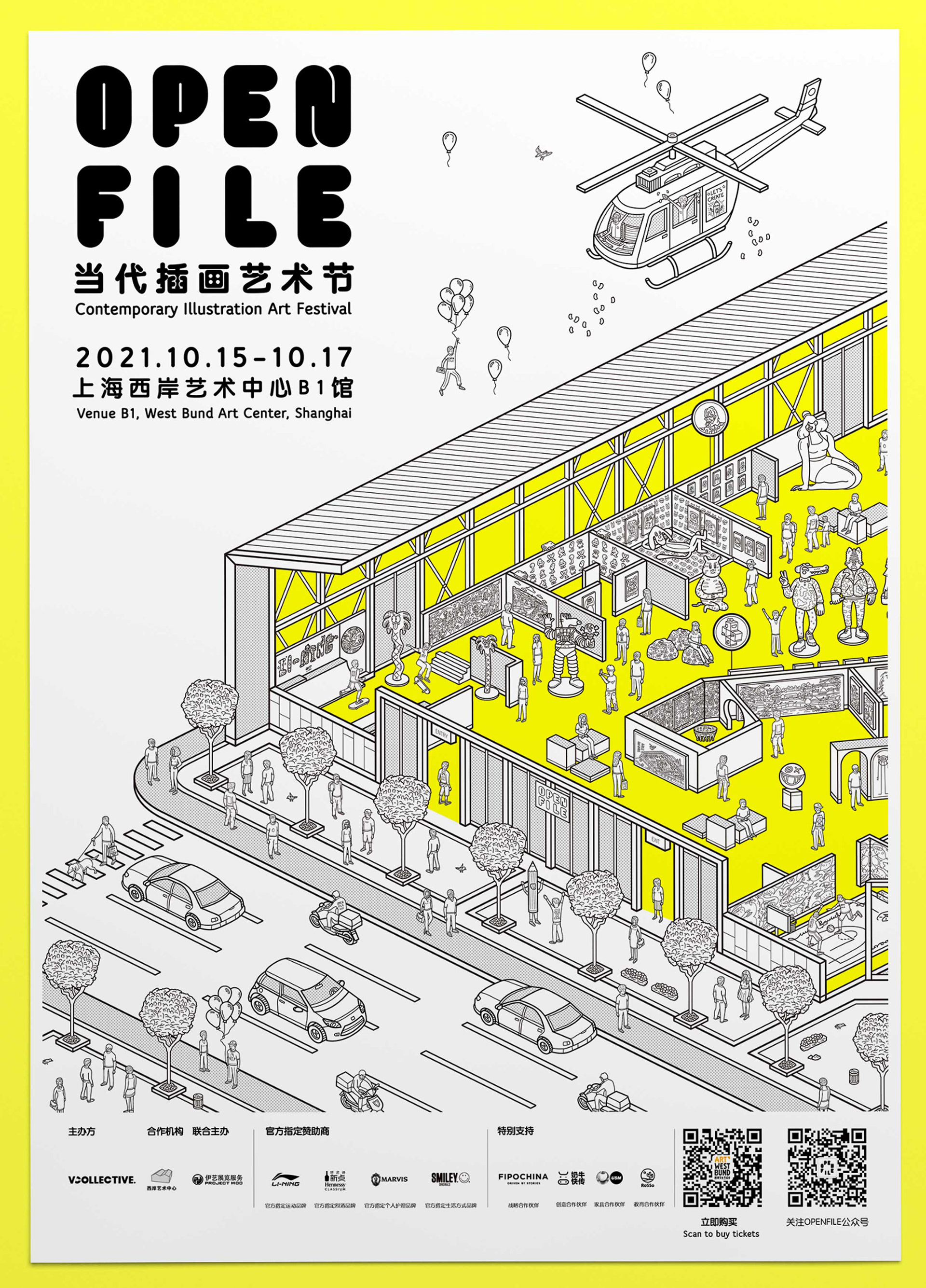 OPENFILE was a contemporary illustration and art festival that took place in Shanghai, China. Its aim was to celebrate the illustration world in all its different forms and showcase the work of 20 artists from all over the world, presenting a huge selection of different artistic mediums to the Chinese audience. My role within the festival was to design the map of the venue, guiding visitors on a playful journey across the West Bund Art Centre.